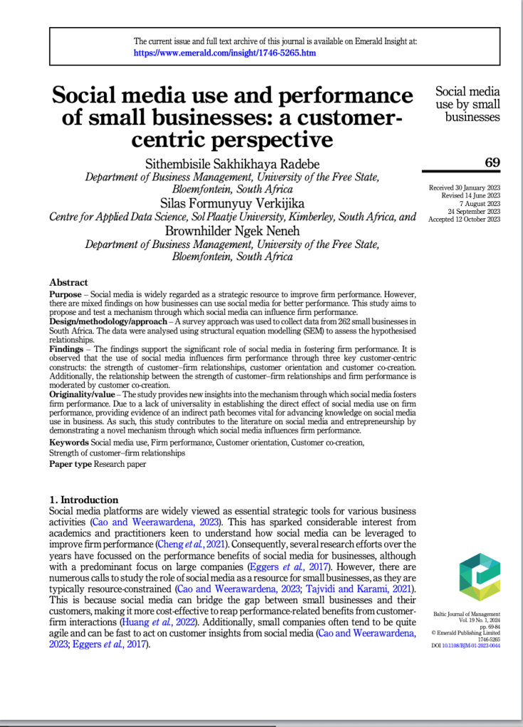 Radebe, Sithembisile & Verkijika, Silas & Neneh, Brownhilder. (2023). Social media use and performance of small businesses: a customer-centric perspective. Baltic Journal of Management. 19. 10.1108/BJM-01-2023-0044.