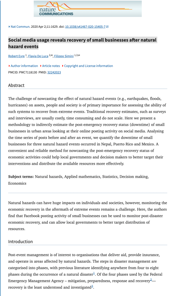 Eyre, R., De Luca, F., & Simini, F. (2020). Social media usage reveals recovery of small businesses after natural hazard events. Nature communications, 11(1), 1629. https://doi.org/10.1038/s41467-020-15405-7